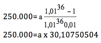 Burada 3 yıl ve aylık taksitler söz konusu olduğu için toplamda 36 taksit yatırılmalıdır. 36 adet eşit taksidin bugünkü değeri alınan 250.000TL’lik borça eşit olmalıdır. Buna göre: