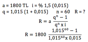 Sude Hanım bankadan aldığı aylık faizi % 1,5 olan ev kredisinin 1800 TL’lik taksitlerini ödemektedir. 60 aylık taksiti kalan Sude Hanım babasından miras kalınca kredisinin tümünü ödeyip kapatmak istemektedir. Sude Hanım bankaya ne kadar ödeme yapmalıdır?