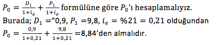 Bir işletmenin adi hisse senedi ₺0,9 dividant ödemekte ve bir dönem sonunda ₺9,8’ye satılabileceği tahmin edilmektedir. Bugün %21 getiri bekleyen bir yatırımcı bu hisse senedini kaç ₺’den almalıdır?