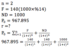 Vadesine 2 yıl kalan %14 faizli 1000 TL nominal değerde bir tahvil 967.895 ye alınırsa bu tahvilin vadeye kadar getiri oranı ne olur?
