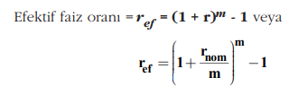 formülü ile hesaplanır. r= 0,14 ve m= 12 (bir yıl) ise değerleri formülde yerine koyduğumuzda efektif faiz oranı = 16,07 olur.