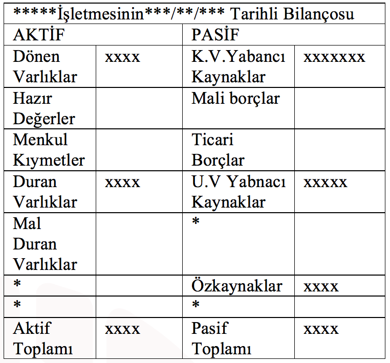 Yukarıda verilen örnek tablo aşağıdaki biçimine göre bilanço türlerinden hangisini ifade eder?