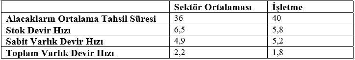 Toplam varlık devir hızının sektöre göre daha düşük olması işletmenin varlıklarını etkin bir şekilde kullanamadığını; ancak sabit varlık hızının ortalamadan yüksek olması sabit varlıklarını etkin kullandığını göstermektedir.