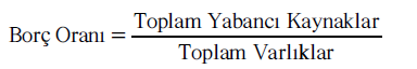 Borç Oranı: Oran, işletme varlıklarının ne kadarının kreditörlerce karşılanmakta olduğunu gösterir. Toplam borçlar, işletmenin hem kısa hem de uzun vadeli tüm borçlarını içerir. Borç oranı aşağıdaki şekilde hesaplanır: