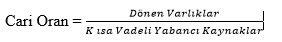 Cari oran; dönen varlıkların kısa vadeli yabancı kaynaklara bölünmesiyle hesaplanır.