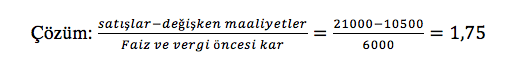 Satışları 21.000 TL, değişken giderleri 10.500 TL ve faiz ve vergi öncesi kârı 6000 TL olan bir işletmenin faaliyet kaldıraç derecesi kaçtır?