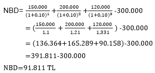 Başlangıç yatırım tutarı 300.000TL ve ekonomik ömrü 3 yıl olan bir projeden 1. yılın sonunda 150.000 TL, 2. yılın sonunda 200.000 TL ve 3. yılın sonunda 120.000 TL nakit girişi beklenmektedir. İskonto oranının %10 olması durumunda söz konusu projenin net bugünkü değerini nedir?