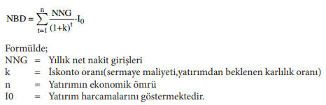 Eğer yatırım projesinin tesis süresi bir yılı aşmıyorsa yatırım harcamalarının bugünkü değerini hesaplamaya gerek olmamaktadır. Projenin tesis süresi bir yılın altında ise, Net Bugünkü Değeri (NBD) aşağıda şekilde formüle edilebilir: