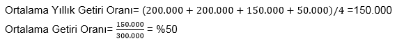 Ekonomik ömrü 4 yıl olan bir projeden ilk 2 yıl boyunca 200.000 TL, 3. yılın sonunda 150.000 TL ve 4. yılın sonunda 50.000.TL gelir beklenmektedir. Bu projenin yatırım tutarı 300.000 TL ise, yatırımın ortalama getiri oranını hesaplayınız.