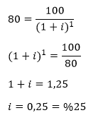 Vadesine 1 yıl kalmış nominal değeri 100 TL olan iskontolu tahvilin piyasa fiyatı 80 TL olduğuna göre tahvilin getirisi % kaçtır?