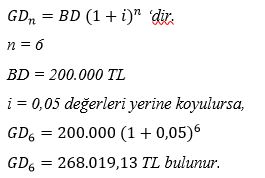 1TL.lik bir yatırımın yıllık i faiz oranıyla n yıl sonraki değeri aşağıdaki formül ile hesaplanır: