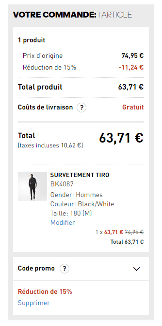 74,95 € est le prix du produit avant la réduction. Il y a une remise de 11, 24 €, donc le prix est réduit à 63,71 €. 10,62 € montre la quantité de la taxe. Sur le ticket on voit que la livraison est gratuite, ça veut dire que le client n'a rien payé d'extra pour recevoir le produit. Donc le total que le client a payé est 63,71 €