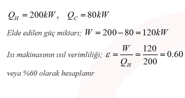 Yüksek sıcaklık fırınından bir ısı makinesine 200 kW’lık ısı akmaktadır. Çevreye verilen atık ısı miktarı 80 kW’tır. Bu ısı makinesinden elde edilen net güç miktarını ve ısı makinesinin verimliliği nedir?