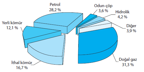 Grafiğe göre Türkiye'nin enerji ihtiyacını karşılayan fosil yakıtlar petrol, doğal gaz, ithal ve yerli kömür tüm enerji miktarının %88.3'ünü karşılamaktadır. Doğru cevap E'dir.