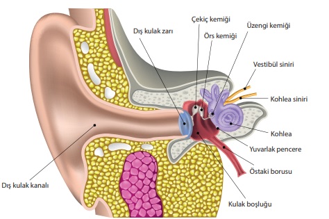 Dış kulak ses dalgalarını toplayarak orta kulak ile arasında yer alan kulak zarına (timpanik zar) iletir. Orta kulakta çekiç (malleus), örs (incus) ve özengi (stapes) adlarını alan 3 küçük kemik sesi iç kulağa iletir.