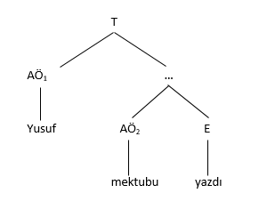 Eylem Öbeği, Tümce olabilmek için Ad Öbeği olan bir özne gerektirir. Ağaca baktığımız zaman AÖ1 ve AÖ2 yaz- eyleminin üyeleridir. Bir başka deyişle, yaz- eylemi anlamı gereği yazılacak bir nesne ve yazacak bir özne ister. Eylem Öbeğinde yanulamlanan üye iç üye, özne ise dış üye olarak adlandırılır. Bu durumda AÖ1’deki Yusuf iç değil, dış ögedir. Yanlış olan ifade D seçeneğidir.