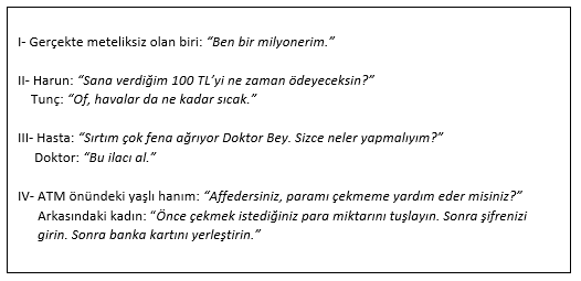 I. örnekte konuşmacı yanlış olduğunu bildiğini paylaşarak Nitelik İlkesini, II. örnekte Tunç Harun’un sorusu ile ilişkin bir yanıt vermeyerek Bağıntı İlkesini, III. örnekte doktor hastanın sorusuna yeterli yanıt vermeyerek Nicelik İlkesini, sonuncu örnekte yaşlı hanıma yardımda bulunan diğer kadın ATM’den para çekme sırasını doğru vermeyerek Tarz İlkesini çiğnemiştir. Doğru sıralama içeren yanıt D’dir.