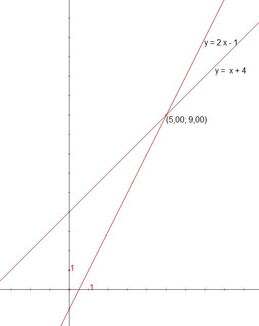 Kesişim noktası her iki doğrunun da üzerindedir. O halde hem 1. denklemi hem de ikinci denklemi sağlayan (x,y) sıralı ikisini bulmalıyız. Cebirsel olarak x+4=2x-1, x=5 olmalıdır. Y=x+4 denkleminde x yerine 5 koyarsak 9 olarak hesaplayabiliriz. Kesşim noktası (5,9) olmalıdır.