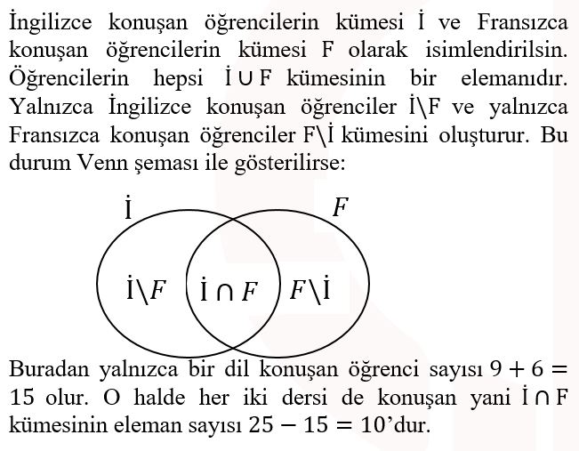 25 kişilik bir sınıfta öğrencilerin tümü İngilizce ve Fransızca dillerinden en az birini konuşmaktadır. Sınıfta yalnızca İngilizce konuşan 9, yalnızca Fransızca konuşan 6 öğrenci olduğuna göre her iki dili de konuşan kaç öğrenci vardır?