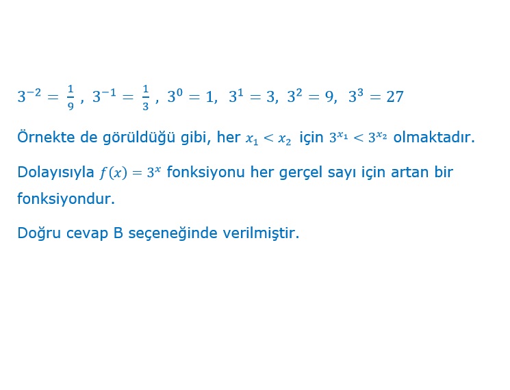 f(0) değerine ulaşmak için x=0 için fonksiyonun grafikte y ekseninde hangi değeri aldığına bakmalıyız. O halde f(0)=1, f(1)=0’dır. O halde I. madde hatalı II. madde doğrudur. f fonksiyonu x eksenindeki tüm gerçel sayılar için tanımlıdır. Ancak değer kümesi sadece pozitif gerçel sayıları kapsar. O halde III. madde doğru, IV. madde hatalıdır. Doğru yanıt II. ve III. maddelerdir.