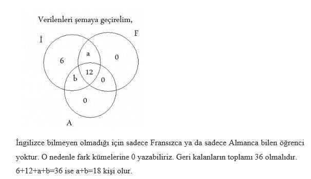 36 kişilik bir sınıfın tamamı İngilizce bilmektedir. 12 kişi aynı zamanda Almanca ve Fransızca da bilmektedir. Sadece İngilizce bilen 6 kişi olduğuna göre bu üç dilden yalnız ikisini bilen kaç kişidir?
