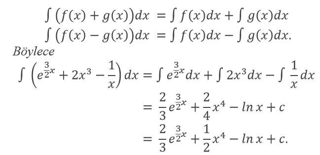 İntegral için toplam ve fark kuralları sırasıyla şu şekildedir: