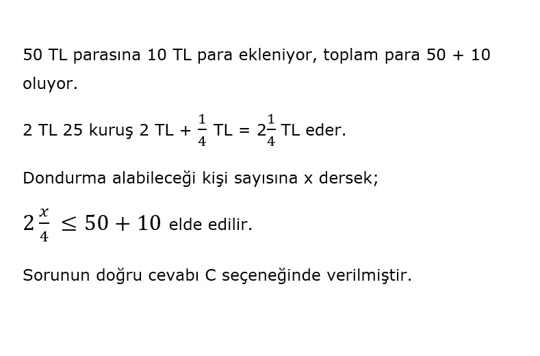 “50 TL param vardı. 10 TL de annem verdi. Bir külah dondurma 2 TL 25 kuruş olduğuna göre, kaç kişiye ısmarlayabilirim?” sorusunun çözümü için aşağıdaki eşitsizliklerden hangisi kullanılır?