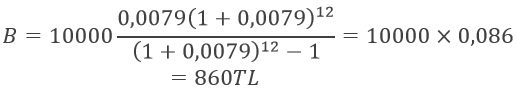 borç amortisman formülünden bankaya ödenecek taksit bulunur. Bu soru için formüldeki değerler A=10000, r=0,0079, n=12'dir. Böylece ödenecek aylık taksit