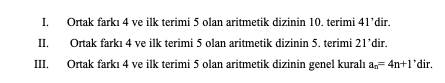 a1=5, a2=5+4=9, a3=5+4+4=13, a4=5+4+4+4=17, a5=5+4+4+4+4=21 olur. O halde II. madde doğrudur. Buradan 5,9,13,17,21,… dizisi elde edilir. Bu dizinin genel kuralı 4n+1’dir. O halde III. madde de doğrudur. 4n+1 de n yerine 10 yazarsak 41 elde ederiz ki bu I. maddenin de doğru olduğunu gösterir. Dolayısıyla tüm maddeler doğrudur.