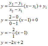 Doğru x ekseninin x = 1 noktasında, y eksenini de y = 2 noktasında kestiğinden bu doğru (1,0) ve (0,2) noktalarından geçer. (x1, y1)=(1, 0) ve (x2, y2)=(0, 2) dersek doğrunu denklemini,