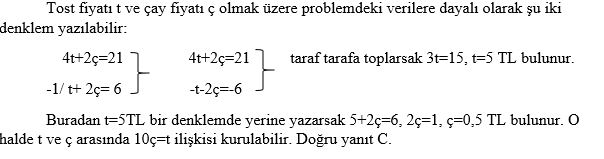 Dört tane tost ve 2 bardak çay için 21 TL ödeyen bir kişi, 1 tane tost ve 2 tane çaya 6 TL ödemiştir. Buna göre tost (t) ve çayın (ç) birim fiyatları arasındaki ilişki nedir?