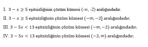 Aşağıda verilen eşitsizlikler ve çözüm kümeleri ile ilgili hangisi/hangileri doğrudur?