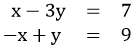 Verilen iki denklemi taraf tarafa toplarsak,x-3y-x+y=7+9 eşitliği elde edilir. Bu eşitliği düzenlersek; -2y=16 buradan da y=-8 bulunur. Bu y değerini ikinci denklemde yerine yazarsak, -x-8=9 eşitliğinden x=-17 bulunur. Böylece aranan çözüm kümesi {(-17, -8)} dir.