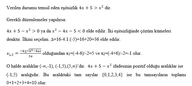 4 katının 5 fazlası karesinden büyük olan tam sayıların toplamı aşağıdakilerden hangisidir?