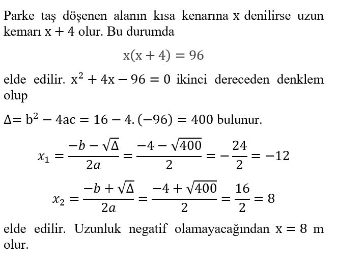 Bir işçi 96 m2’lik bir alana parke taş döşemiştir. Bu alanın uzun kenarı, kısa kenarından 4 m daha uzun olduğuna göre taş döşenen bu alanın kısa kenar uzunluğu aşağıdakilerden hangisidir?
