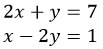 Yerine koyma yöntemi ile çözersek, 2x+y=7 denkleminde y çekilirse y=7-2x elde edilir. Bu ifade x-2y=1 denkleminde yerine yazılırsa
