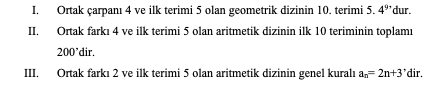 Ortak çarpanı 4 ve ilk terimi 5 olan geometrik dizinin terimleri 5, 5.4, 5.42,... biçimdedir. O halde 10. terimi 5. 49’dur. I. madde doğrudur.