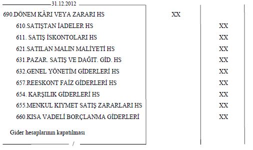 Gider hesapları da borç tarafları ile çalıştıklarından, borç kalanı verirler. Bu hesapların kapatılması için de gider hesapları borç kalanları kadar alacaklandırılırken, 690. Dönem Kârı veya Zararı hesabı borçlandırılır.