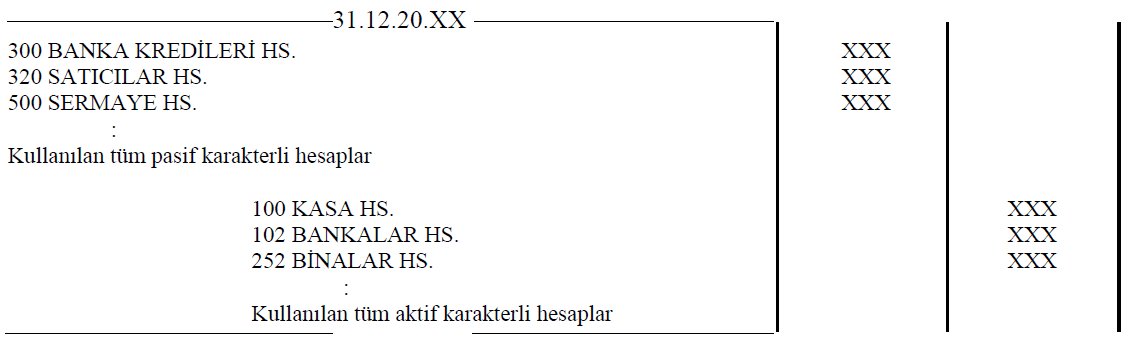 Muhasebenin temel kavramlarından dönemsellik kavramı gereğince, her hesap dönemi diğerinden bağımsız olduğundan, dönem sonu işlemleri tamamlanıp gerekli finansal tablolar düzenlendikten sonra, o döneme ait hesapların da kapatılarak dönemin sona erdirilmesi gerekir. Bir hesabın kapalı olması, borç ve alacak taraf toplamlarının birbirine eşit olması anlamına gelir. Bu nedenle, kesin mizanda borç kalanı veren varlık hesaplarının borç kalanı kadar alacaklandırılması, alacak kalanı veren kaynak hesaplarının ise alacak kalanı kadar borçlandırılması halinde ilgili hesaplar kapatılmış olacaktır. Bunun için yevmiye defterinde kapanış maddesi düzenlenir. Bu madde büyük defter hesaplarına aktarıldığı zaman bütün hesapların borç ve alacak eşitliği sağlanacak ve dönem sonunda açık bir hesap kalmayacaktır. Kapanış maddesi aşağıdaki gibi yapılır:
