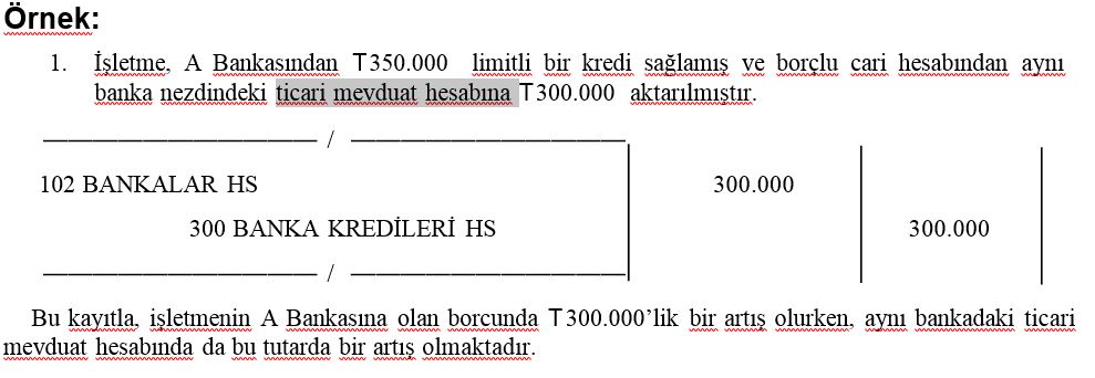 Bankadaki kredi hesabından ticari mevduat hesabına para aktarılması |