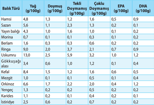 Aşağıda yer alan tablo incelendiğinde su ürünleri içerisinde en yüksek yağ asidi oranının uskumruda olduğu görülmektedir.