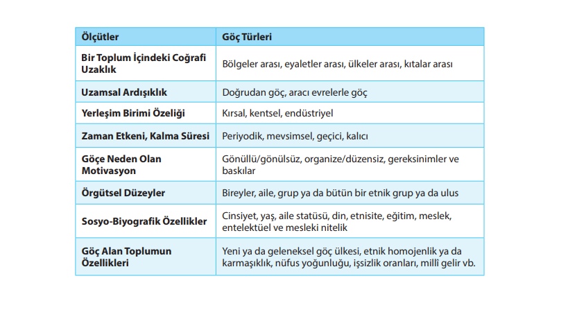 Verilen ölçütler ve göç türlerine ilişkin doğru eşleştirme aşağıdakilerden hangisidir?