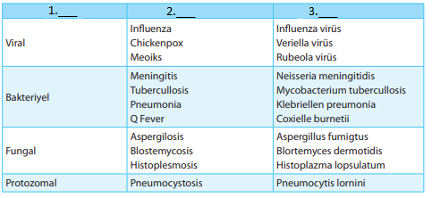 Aşağıdaki sularla ilgili hastalıkları gösteren tabloda boş alanlara sırasıyla gelmesi gereken başlıklar hangi seçenekte doğru olarak sıralanmıştır.