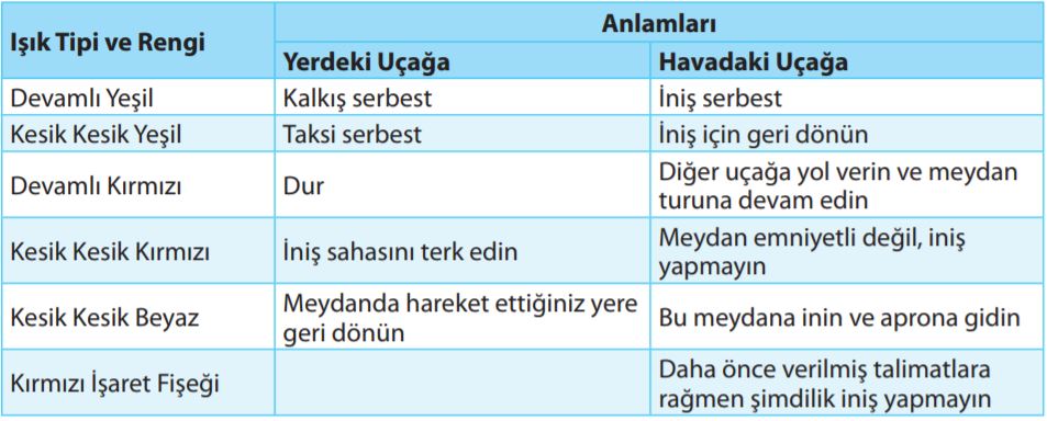 Meydan kontrolörü tarafından ilgili uçağa doğrultularak aldiz lambası ile gönderilen ışık sinyallerinin anlamları aşağıdaki tabloda verilmiştir. Doğru yanıt A seçeneğidir.