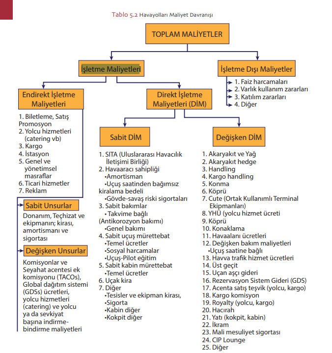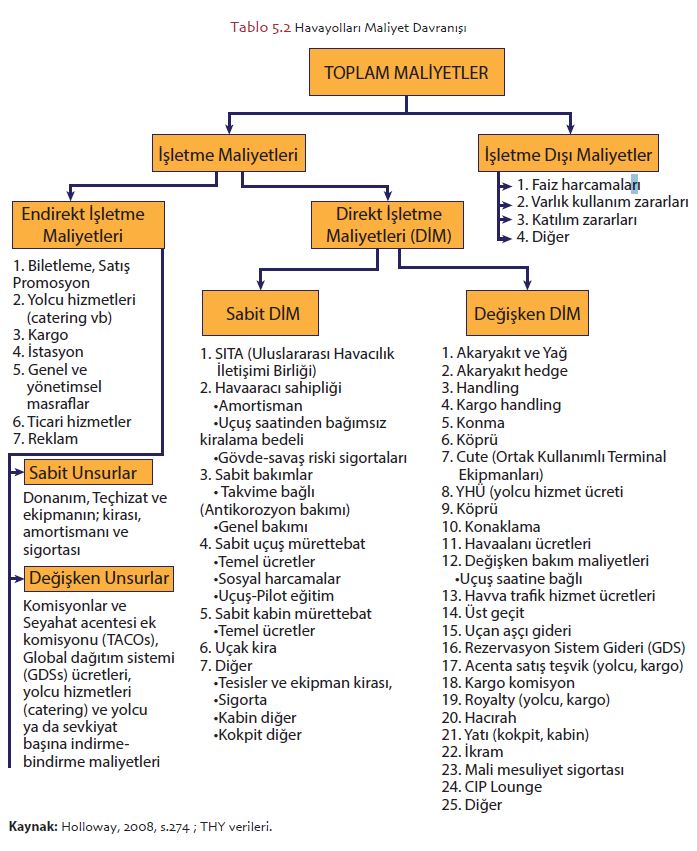 Havayolu işletmelerinde sabit ve değişken maliyetlerin sınıflandırılabilmesi, performans ölçümü, kârlılık analizi, fayda-maliyet analizi gibi etkinliklerin yürütülmesine ve böylece işletmenin verimliliğinin ölçümlenmesine olanak sağlamaktadır. Tablo 2’de bir havayolu işletmesinin; işletme-işletme dışı maliyetleri, doğrudan-dolaylı maliyetleri ve sabit-değişken maliyetleri açısından sınıflandırılması örneklendirilmiştir.