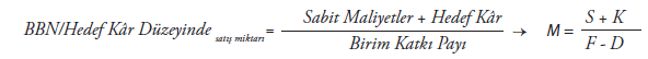 Hedeflenen karlılık düzeyi için gereken satış miktarı formülü aşağıda verilmiştir.