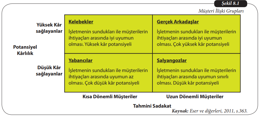 Werner ve Kumar (2002) müşterileri potansiyel kârlılık ve sadakat düzeylerine göre dört alt gruba ayırmışlardır. Buna göre “Kelebekler” sadakat düzeyleri düşük olmasına karşın işletmeye yüksek kâr sağlayan müşteri grubudur. İşletmenin sundukları ile bu grup müşterinin ihtiyaçları arasında iyi bir uyum bulunmaktadır. Hem sadakat düzeyi yüksek hem de işletmeye yüksek kâr sağlayan müşteri grubu ise “Gerçek Arkadaşlar” grubudur. Düşük müşteri sadakati olan ve düşük kâr sağlayan müşteriler “yabancılar” olarak isimlendirilmiştir. “Salyangozlar” ise sadık fakat işletmeye az kâr sağlayan müşteri grubudur.