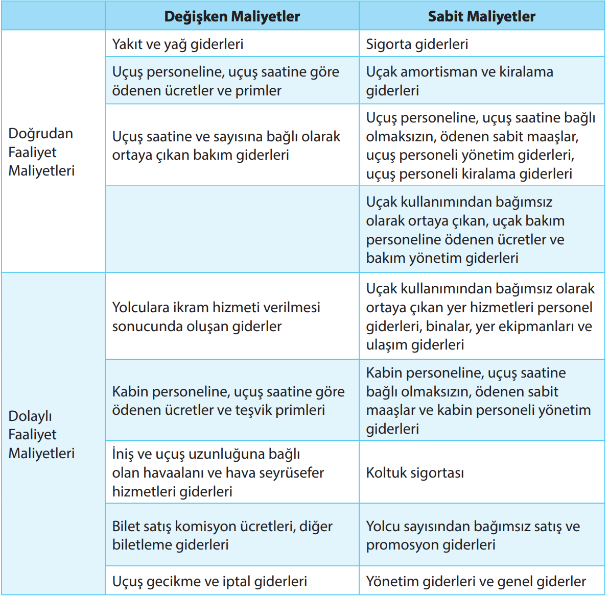 Aşağıdaki seçeneklerden hangisi havayolu işletmelerindeki doğrudan faaliyet maliyetleri arasında yer almaktadır?