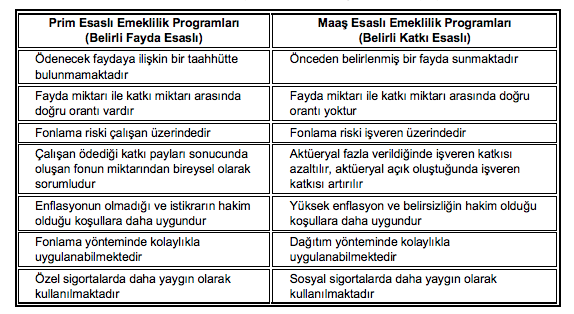 Prim esaslı ve maaş esaslı emeklilik programlarının karşılaştırılması aşağıdaki tabloda incelenebilir:
