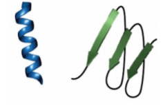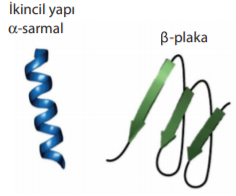Soruda verilen şekil proteinlerin ikincil (sekonder) yapısını göstermektedir. İkincil (sekonder) yapı: amino asitlerin karbonil ve imido grupları arasında hidrojen bağları oluşması sonucu amino asit zincirinde sarmal ya da tabaka şeklinde katlanmalar ile meydana gelen üç boyutlu yapıdır. Zayıf hidrojen bağları aynı amino asitin grupları arasında ya da farklı amino asitin grupları arasında olabilir. Bu şekilde meydana gelen yapılara 1-) alfa-sarmal ve 2-) beta- plaka yapı denir. Doğru cevap C'dir.